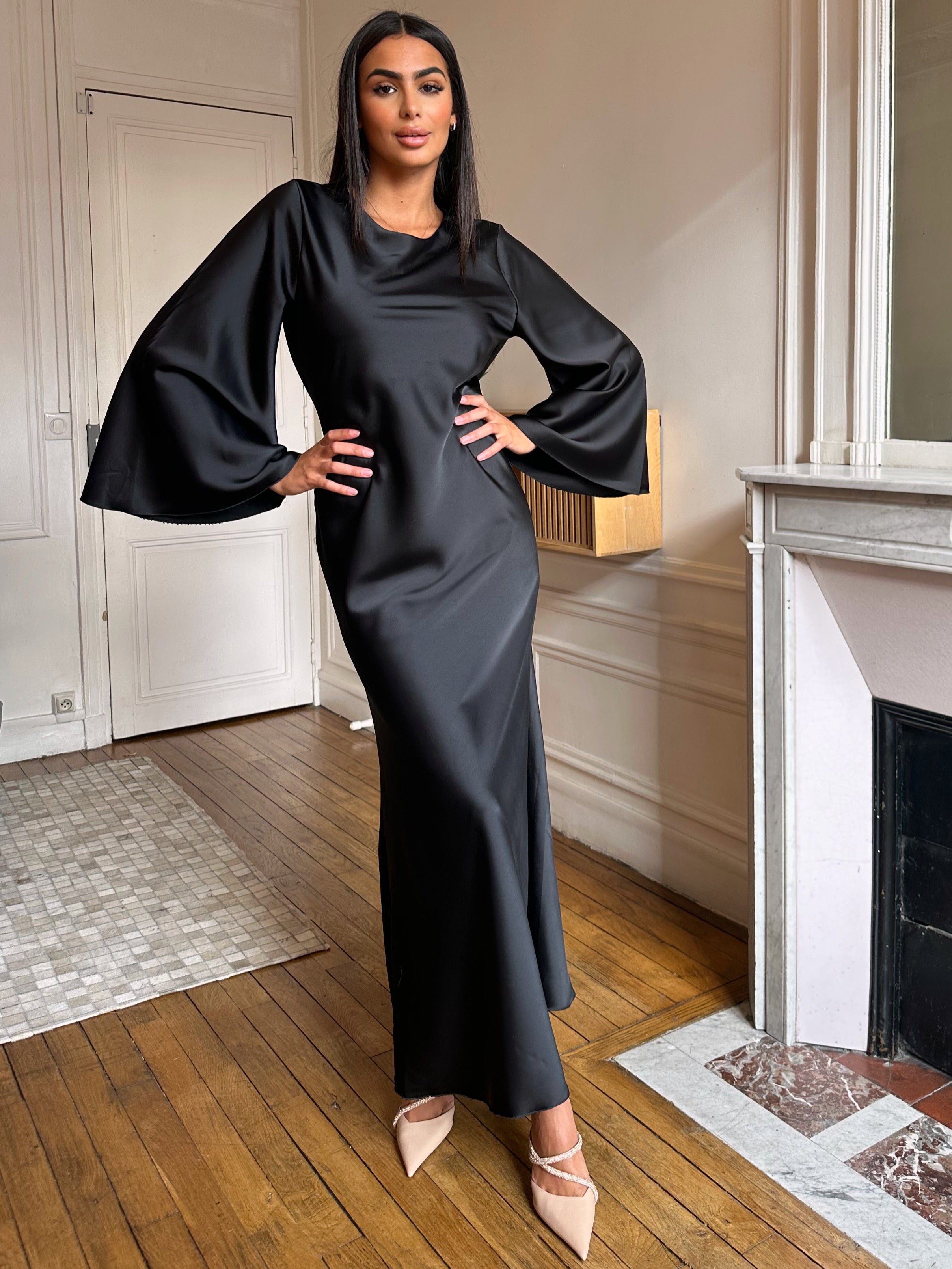 La robe 'Donia' est conçue en tissu satiné doux et fluide. Elle a une coupe longue qui rappelle les silhouettes classiques pour une allure intemporelle. Sa matière soyeuse et son col rond contrasté donnent une look charme et élégant.