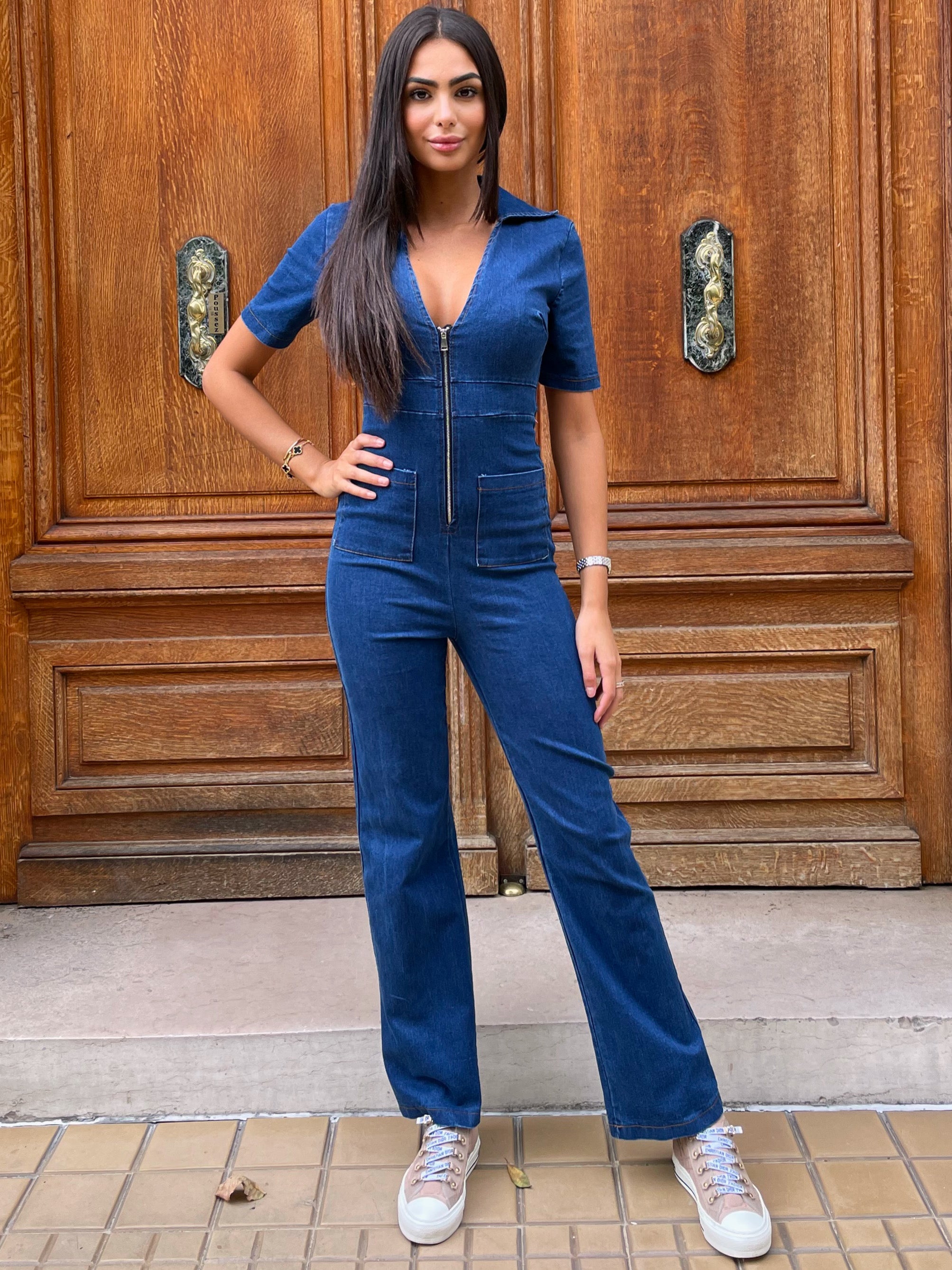 'Tisse' est une combinaison en jeans col V avec manches courtes et fermeture éclair à l'avant. Doté d'une coupe tendance et d'une fermeture zippée discrète, cette pièce offre un look chic et sexy à la fois. Une pièce indispensable à intégrer à votre garde-robe.